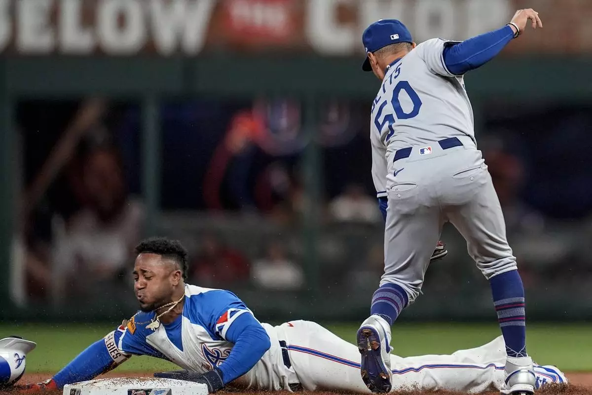 Atlanta Braves' Ozzie Albies (1) steals second base against Los Angeles Dodgers shortstop Mookie Betts (50) in the second inning of a baseball game, Saturday, May 3, 2025, in Atlanta. (AP Photo/Mike Stewart)