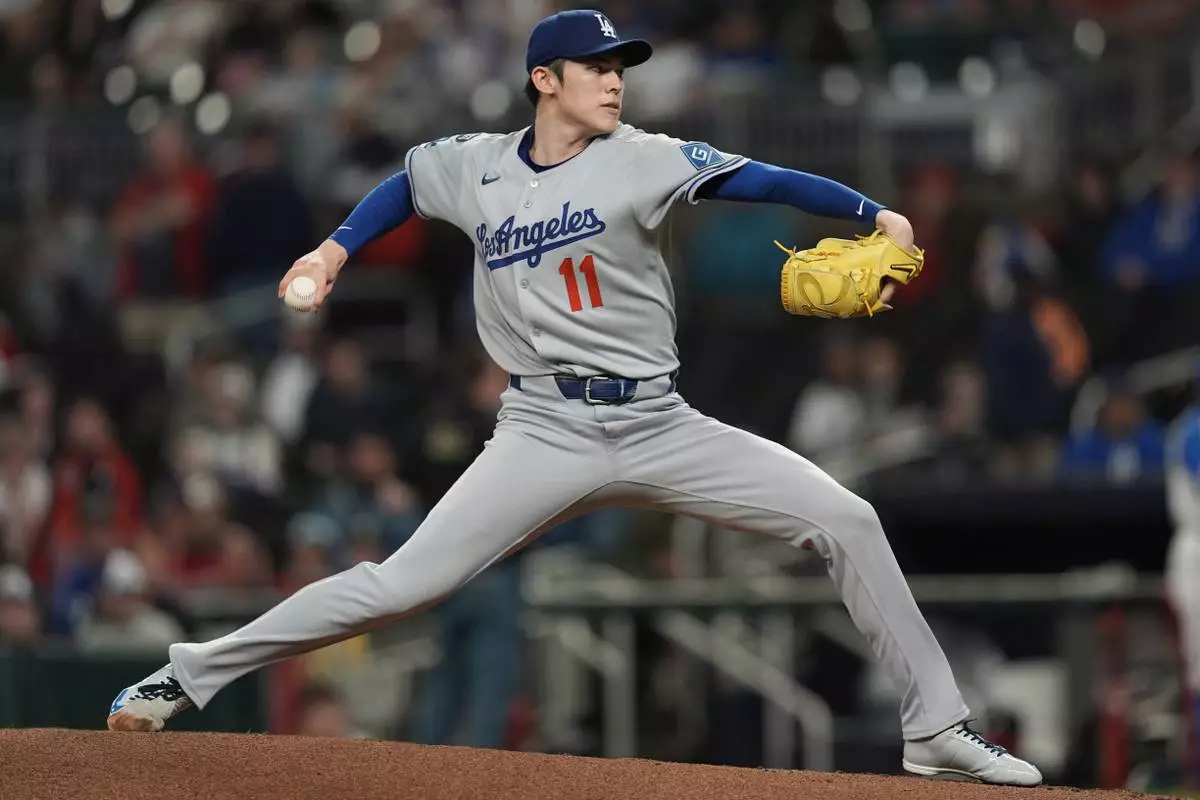 Los Angeles Dodgers pitcher Roki Sasaki (11) delivers against the Atlanta Braves in the first inning of a baseball game, Saturday, May 3, 2025, in Atlanta. (AP Photo/Mike Stewart)