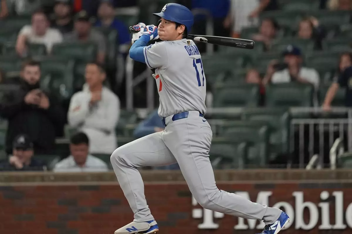 Los Angeles Dodgers two-way player Shohei Ohtani (17) hits a single against the Atlanta Braves in the first inning of a baseball game, Saturday, May 3, 2025, in Atlanta. (AP Photo/Mike Stewart)