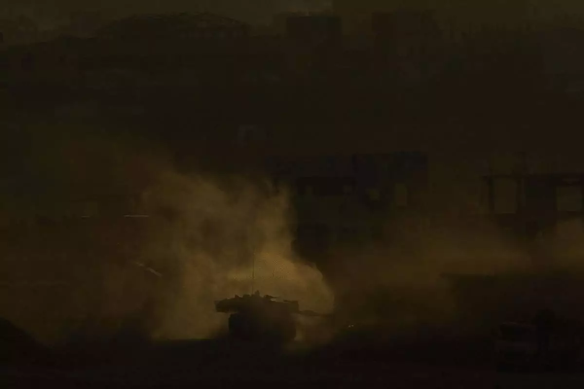 An Israeli army tank maneuvers in the Gaza Strip is seen from southern Israel, Sunday, May 4, 2025. (AP Photo/Ariel Schalit)