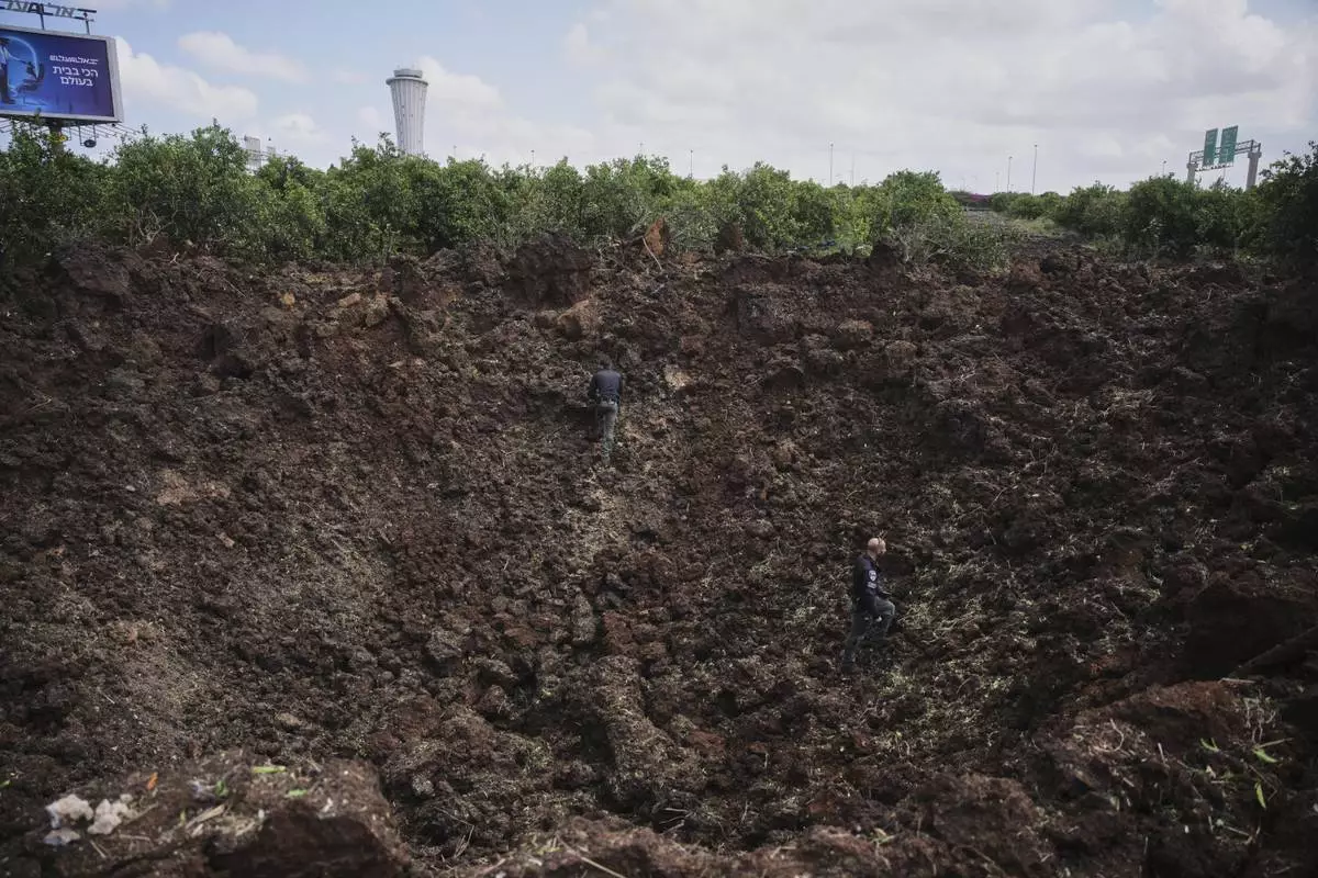 Israeli security forces inspect a crater at the site where the Israeli military said a projectile fired by Yemen's Houthi rebels landed in the area of Ben Gurion International Airport near Tel Aviv, Israel, on Sunday, May 4, 2025. (AP Photo/Ohad Zwigenberg)