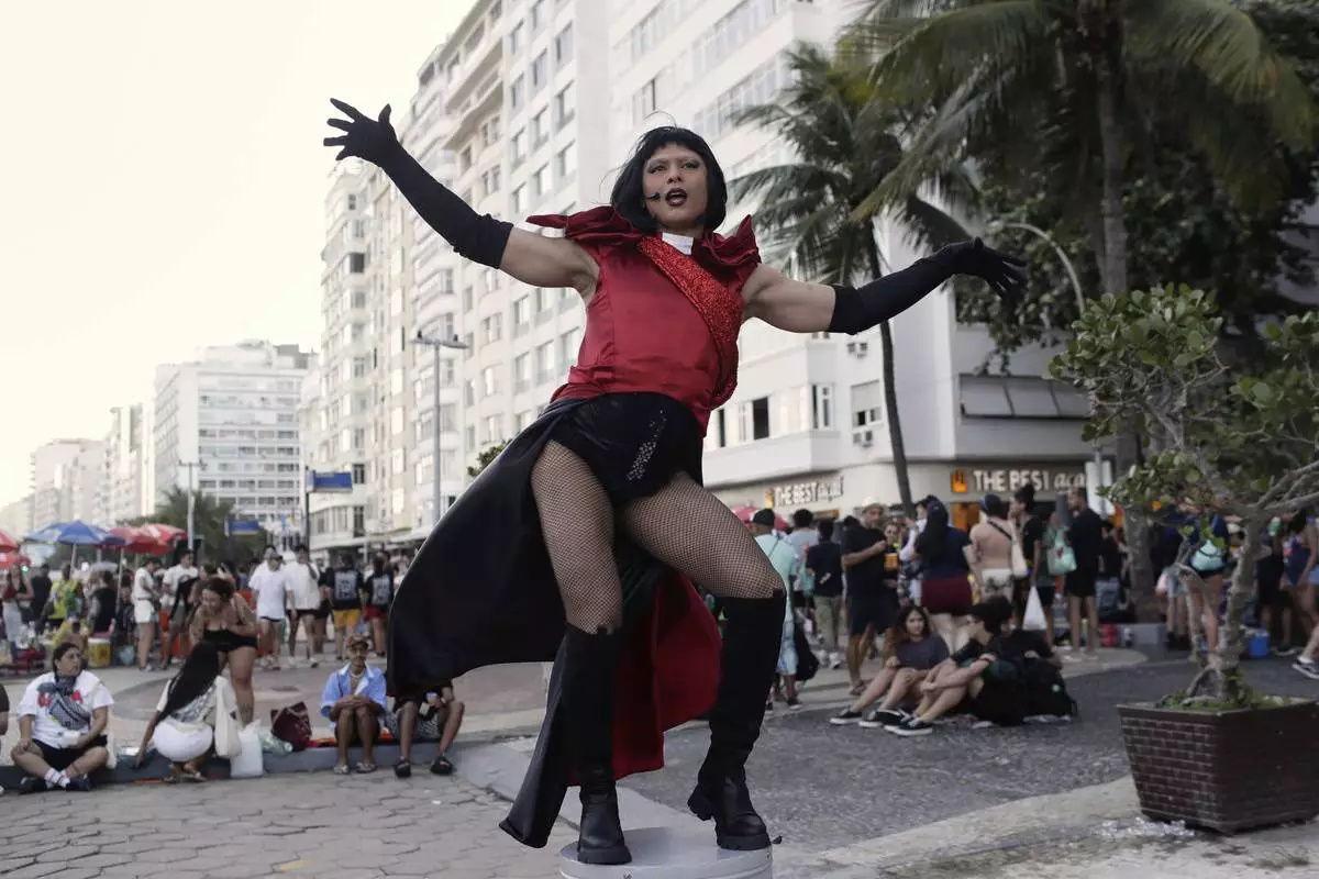 An artist dressed in an outfit inspired by Lady Gaga performs outside the Copacabana Palace hotel where the pop diva is staying, in Rio de Janeiro, Thursday, May 1, 2025. Lady Gaga is in Rio to give a free concert, that will be held on Saturday, at Copacabana Beach. (AP Photo/Bruna Prado)