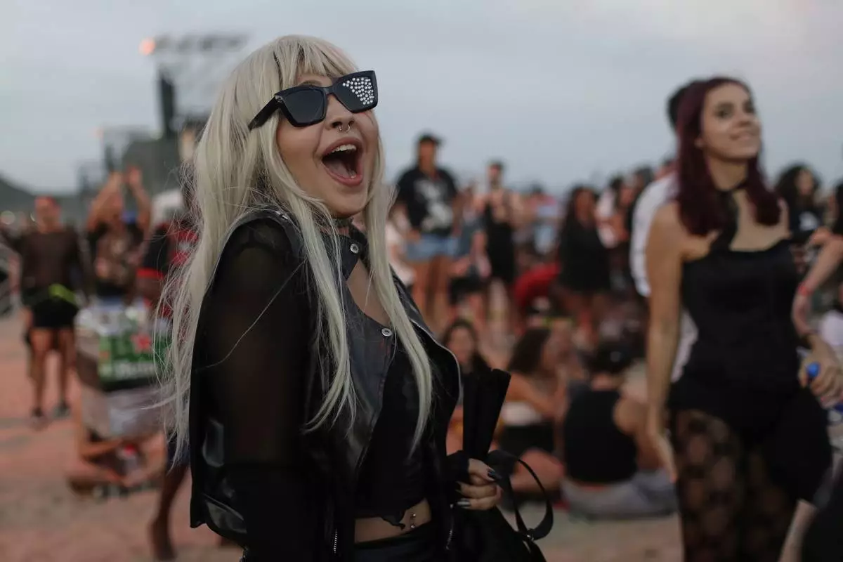 A fan strikes a pose as she waits for the start of Lady Gaga's free concert on Copacabana beach in Rio de Janeiro, Saturday, May 3, 2025. (AP Photo/Bruna Prado)