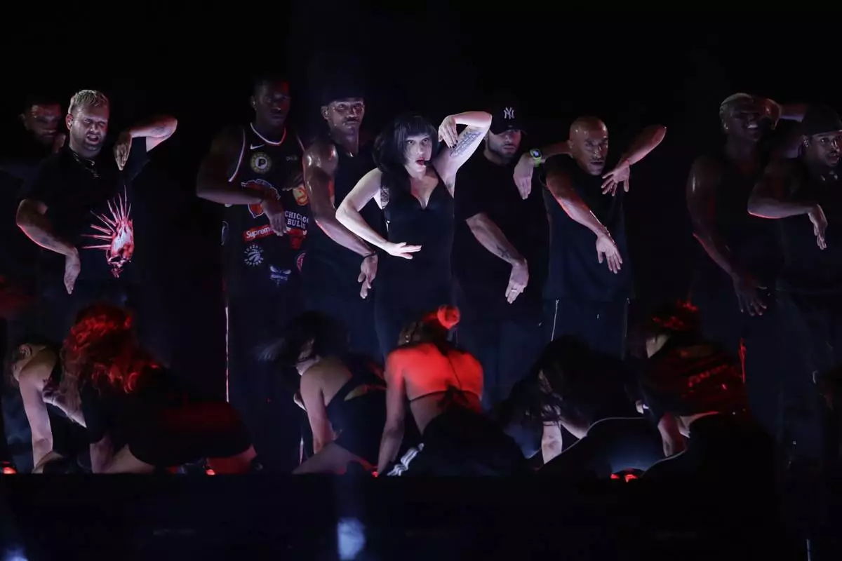 Lady Gaga, center, performs during her free concert on Copacabana Beach in Rio de Janeiro, Saturday, May 3, 2025. (AP Photo/Silvia Izquierdo)