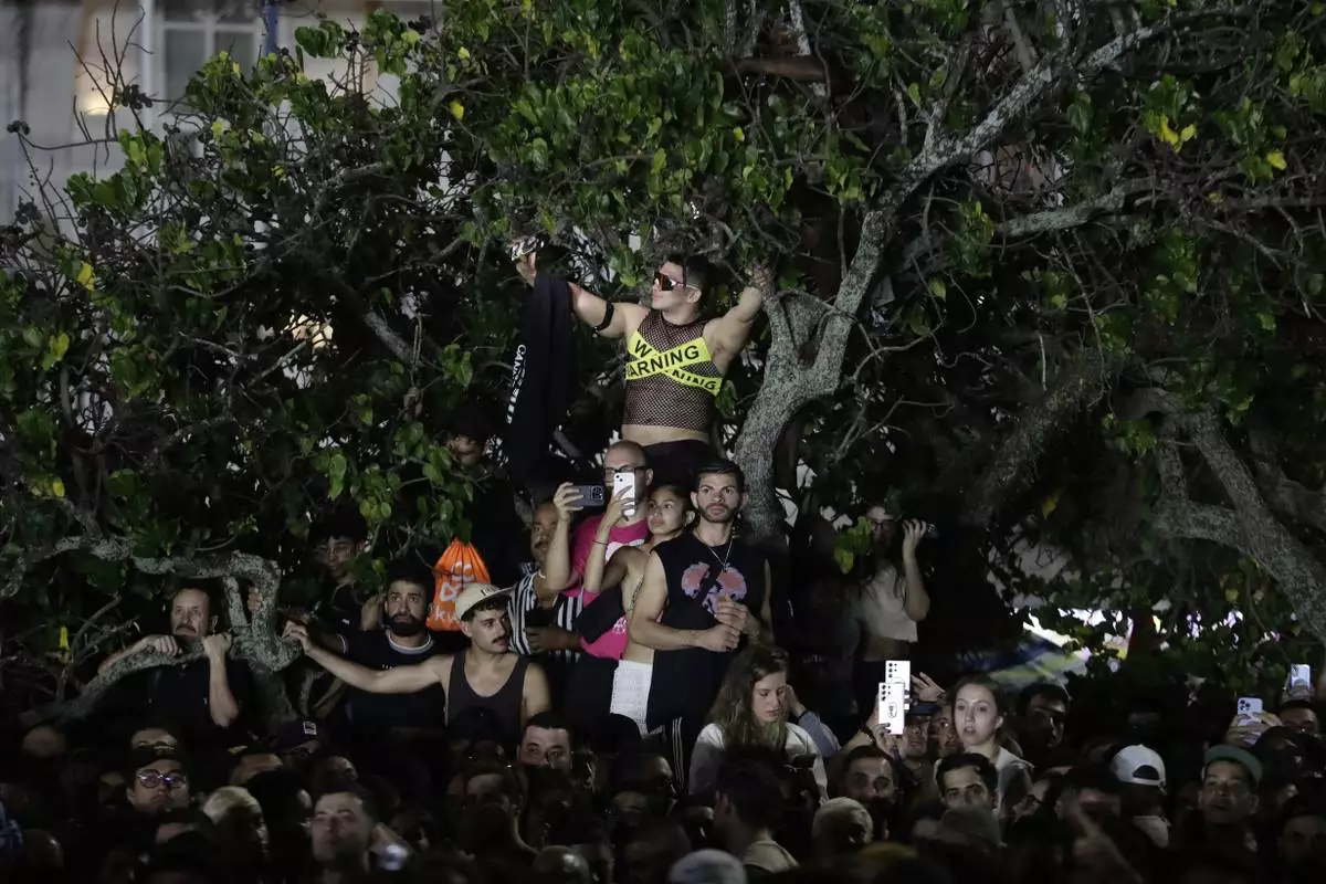 Lady Gaga fans dance outside the Copacabana Palace hotel where the pop diva is staying, in Rio de Janeiro, Thursday, May 01, 2025. Lady Gaga is in Rio to give a free concert, that will be held on Saturday, at Copacabana Beach. (AP Photo/Bruna Prado)