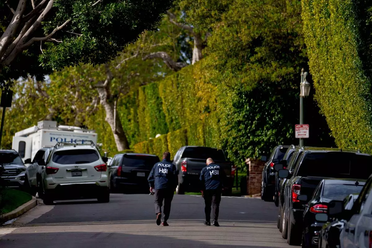 FILE - Law enforcement personnel walk on a street near after federal law enforcement executed a raid at a property belonging to Sean "Diddy" Combs on March 25, 2024, in Los Angeles. (AP Photo/Eric Thayer, File)