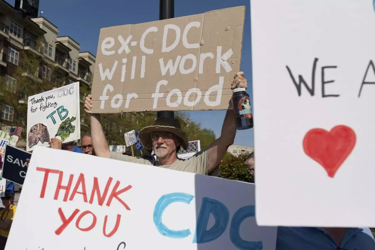 FILE - Demonstrators hold a rally in support of the Centers for Disease Control and Prevention in front of the agency's headquarters in Atlanta, Tuesday, April 1, 2025, after layoffs were announced. (AP Photo/Ben Gray, File)
