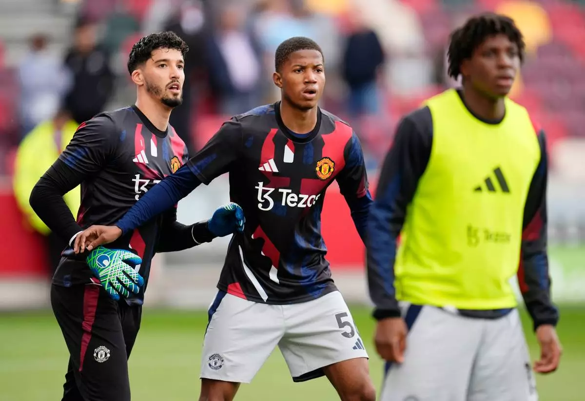 Manchester United's Chido Obi, center, and goalkeeper Altay Bayindir warming up before the English Premier League soccer match against Brentford at the Gtech Community Stadium, London, Sunday, May 4, 2025. (Nick Potts/PA via AP)