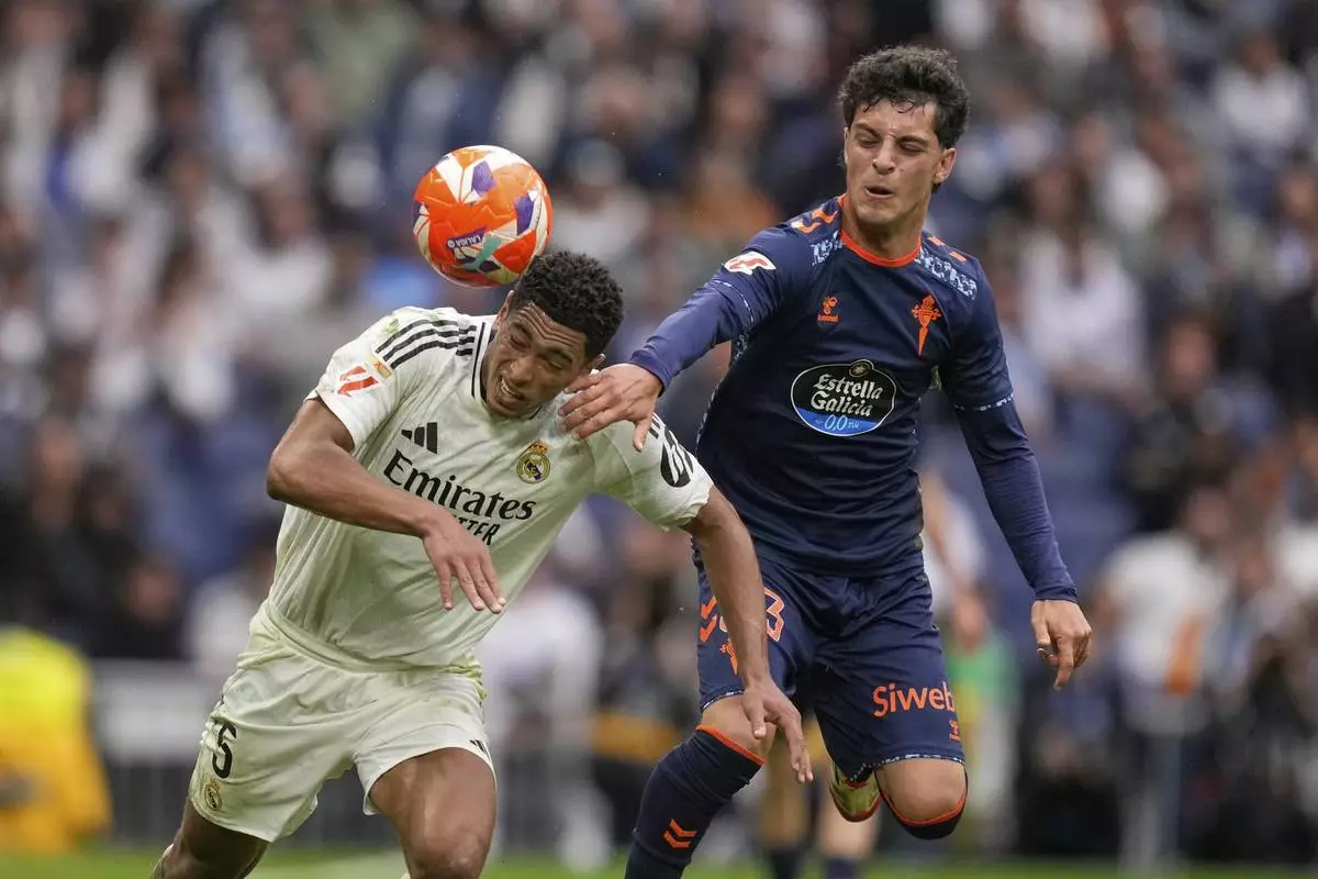 Real Madrid's Jude Bellingham, left, heads the ball ahead of Celta's Hugo Alvarez during the Spanish La Liga soccer match between Real Madrid and Celta Vigo at the Santiago Bernabeu stadium in Madrid, Spain, Sunday, May 4, 2025. (AP Photo/Jose Breton)