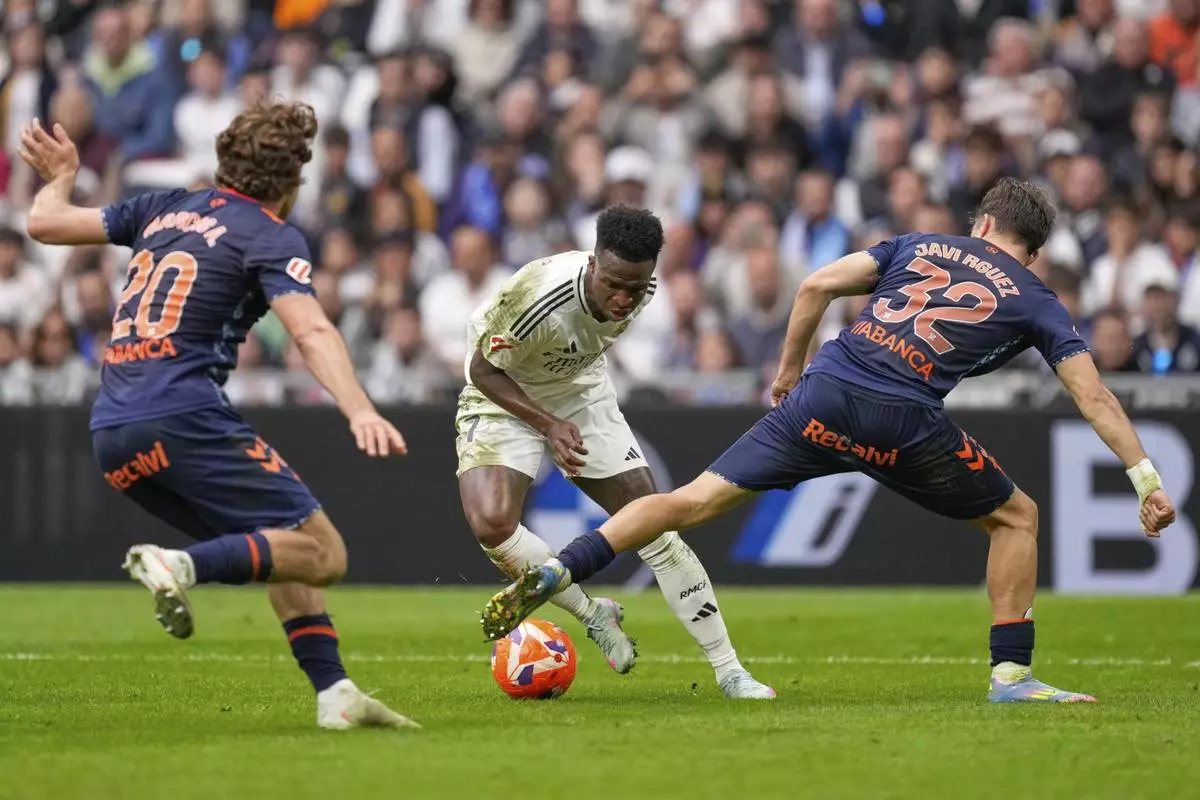Real Madrid's Vinicius Junior, centre, challenges for the ball with Celta's Marcos Alonso, left, and Celta's Javi Rodriguez during the Spanish La Liga soccer match between Real Madrid and Celta Vigo at the Santiago Bernabeu stadium in Madrid, Spain, Sunday, May 4, 2025. (AP Photo/Jose Breton)