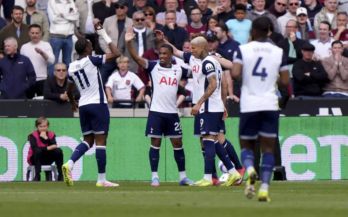 Tottenham Hotspur's Wilson Odobert celebrates scoring his side's first goal of the game, during the English Premier League soccer match between West Ham United and Tottenham Hotspur, at the London Stadium, in London, Sunday May 4, 2025. (Bradley Collyer/PA via AP)