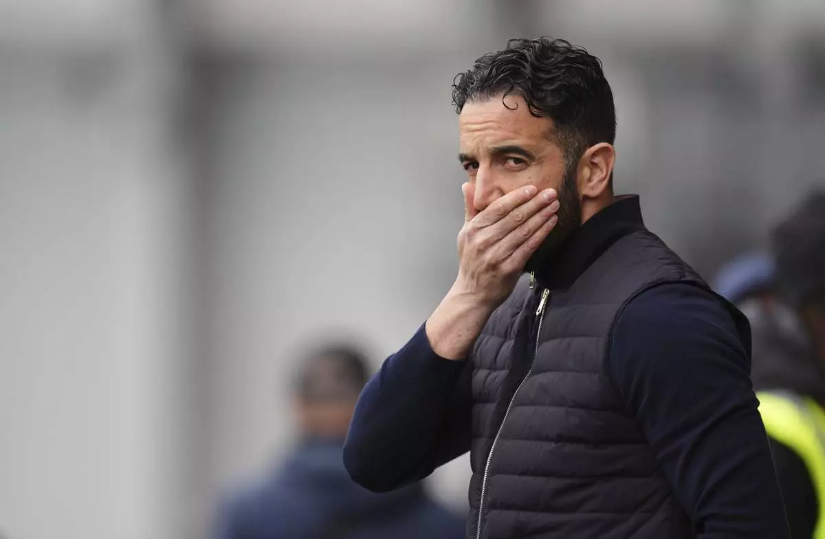 Manchester United manager Ruben Amorim on the touchline before the English Premier League soccer match between Brentford and Manchester United at the Gtech Community Stadium, London, Sunday, May 4, 2025. (John Walton/PA via AP)