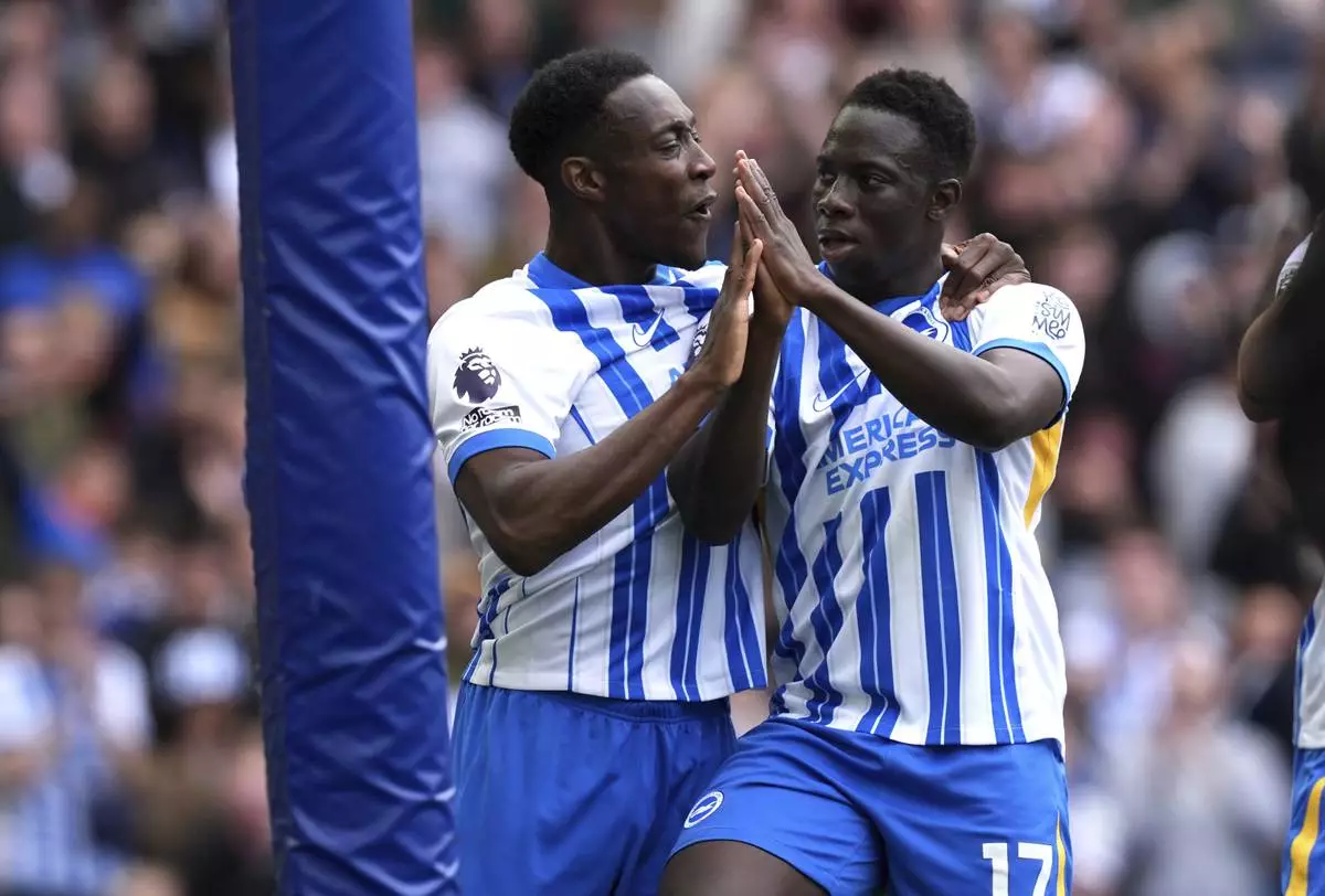 Brighton and Hove Albion's Yankuba Minteh, right, celebrates with Danny Welbeckduring after scoring the opening goal during the English Premier League soccer match between Brighton and Hove Albion and Newcastle United in Brighton and Hove, England, Sunday, May 4, 2025. (Gareth Fuller/PA via AP)