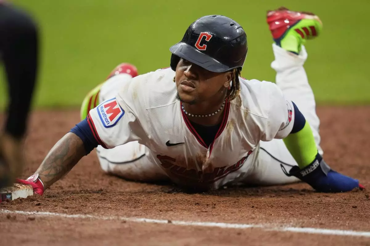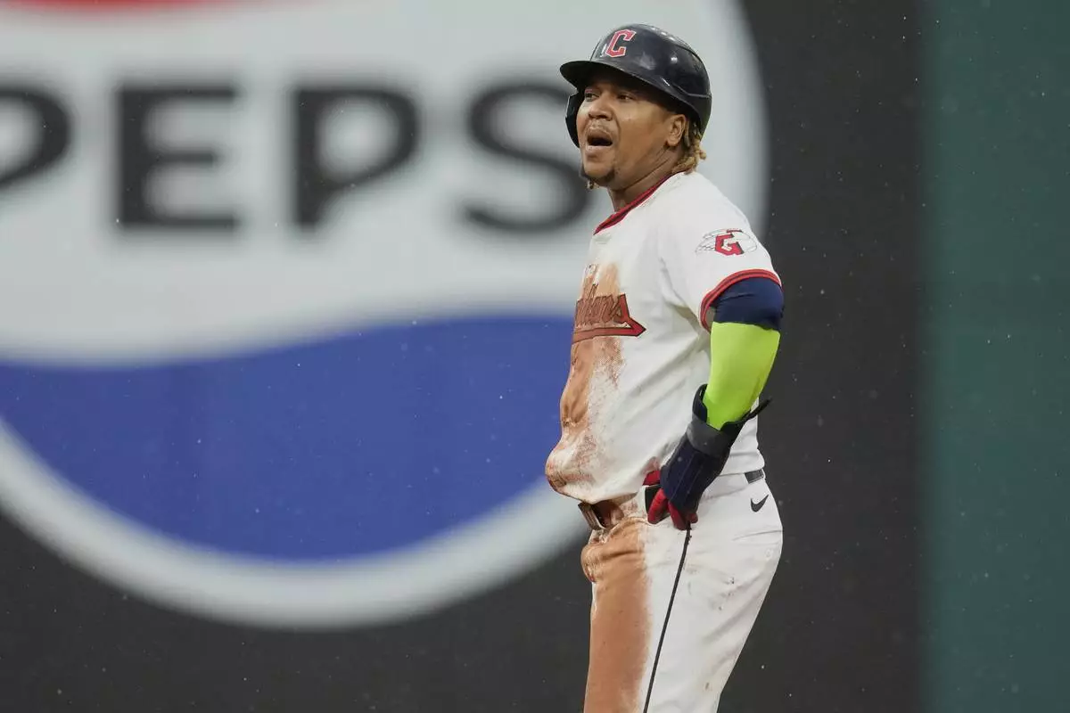 Cleveland Guardians' Jose Ramirez reacts after stealing second base, his 250th career steal, in the 10th inning of a baseball game against the Minnesota Twins in Cleveland, Thursday, May 1, 2025. (AP Photo/Sue Ogrocki)