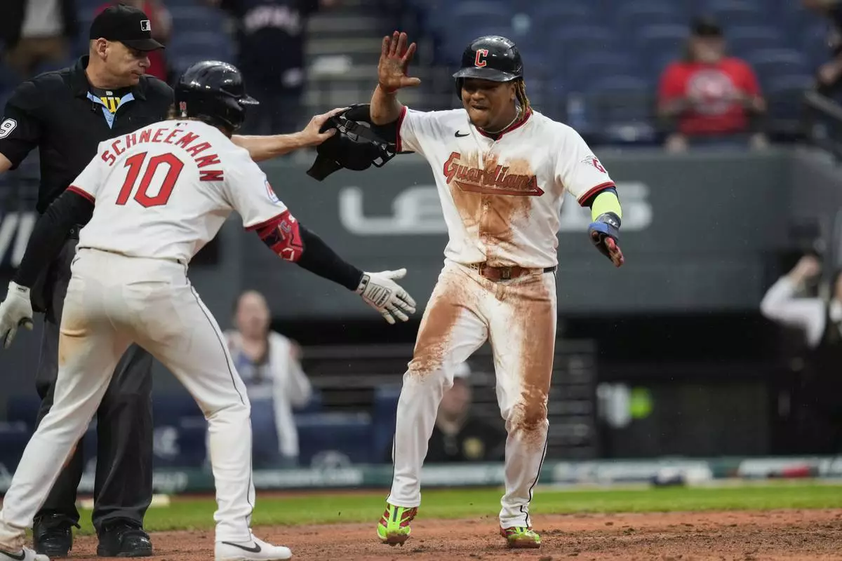 Cleveland Guardians' Jose Ramirez, right, celebrates with teammate Daniel Schneemann (10) after scoring the winning run in the 10th inning of a baseball game against the Minnesota Twins in Cleveland, Thursday, May 1, 2025. (AP Photo/Sue Ogrocki)