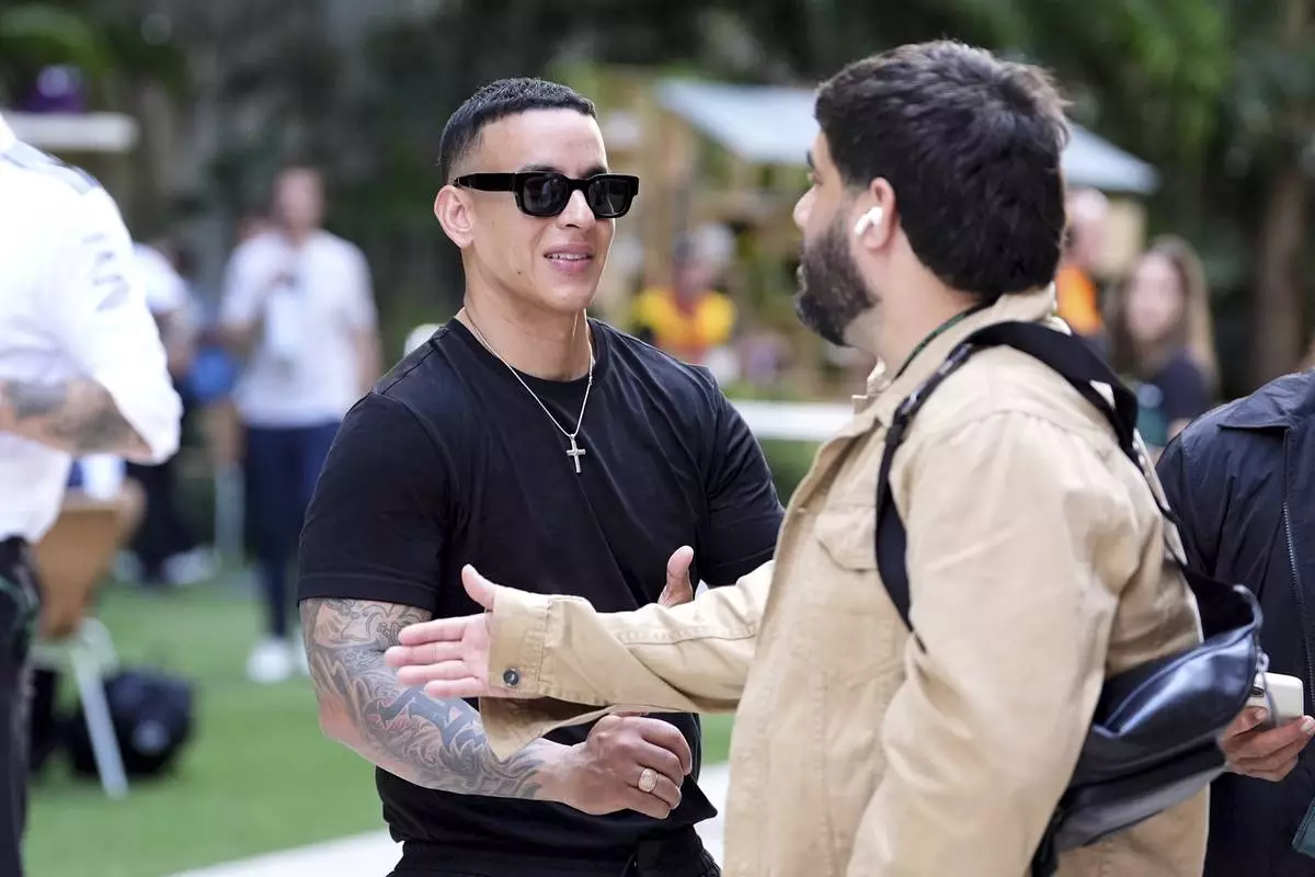 Puerto Rican singer Daddy Yankee, left, speaks with an acquaintance in the paddock area ahead of the Formula One Miami Grand Prix auto race, Thursday, May 1, 2025, in Miami Gardens, Fla. (AP Photo/Rebecca Blackwell)