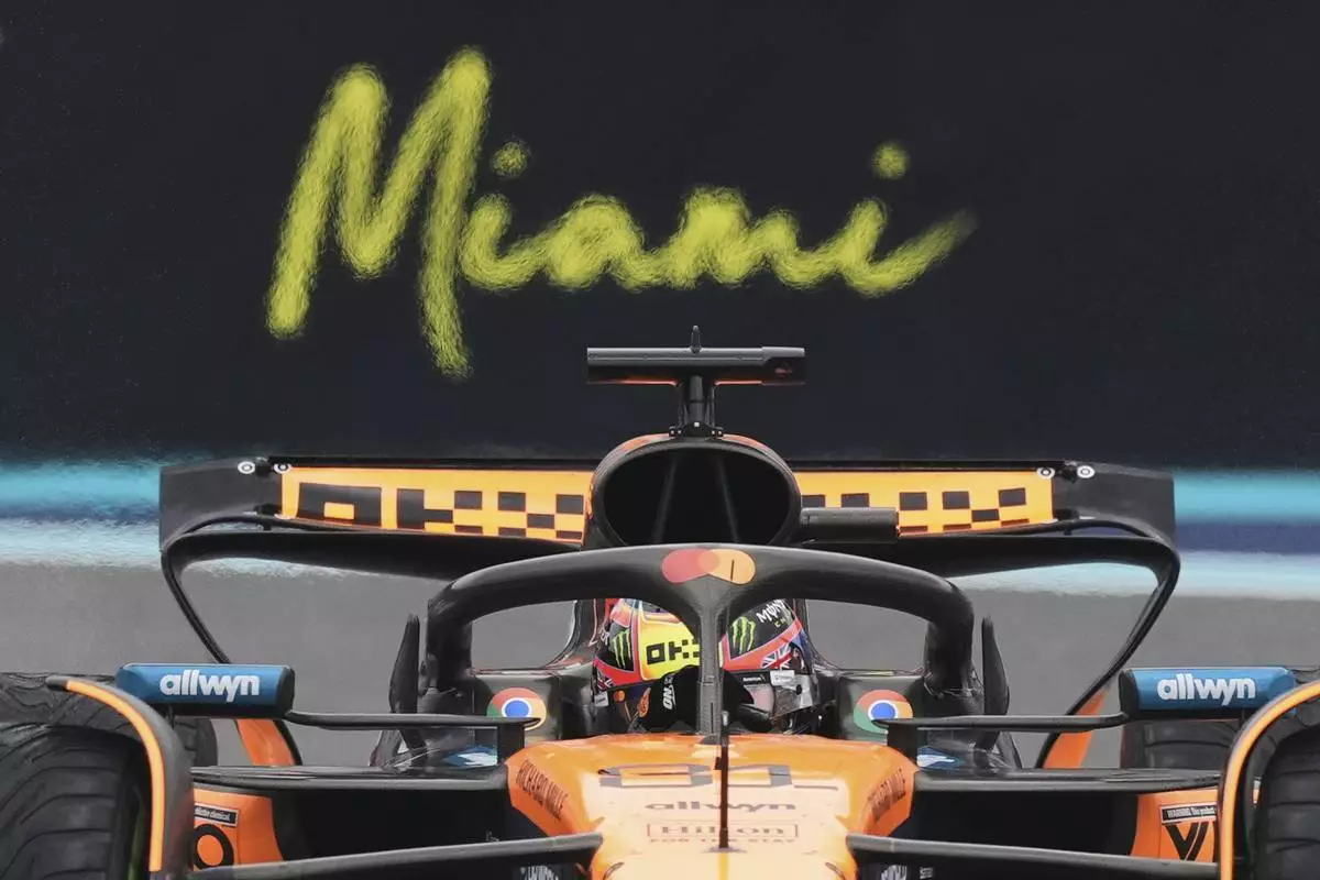 McLaren driver Oscar Piastri of Australia steers his car during the Sprint race at the Formula One Miami Grand Prix auto race, Saturday, May 3, 2025, in Miami Gardens, Fla. (AP Photo/Rebecca Blackwell)