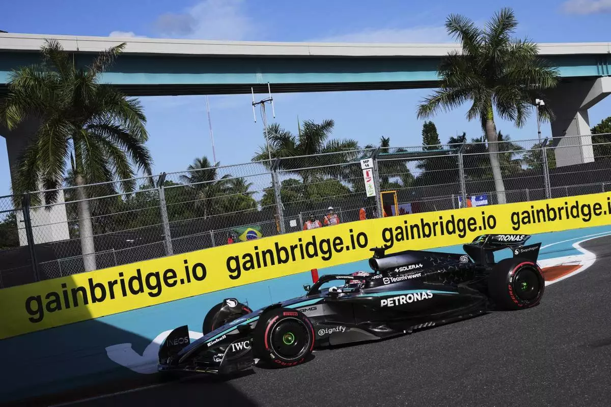 Mercedes driver George Russell of Britain steers his car during the Sprint race qualifying session at the Formula One Miami Grand Prix auto race, Friday, May 2, 2025, in Miami Gardens, Fla. (AP Photo/Rebecca Blackwell)