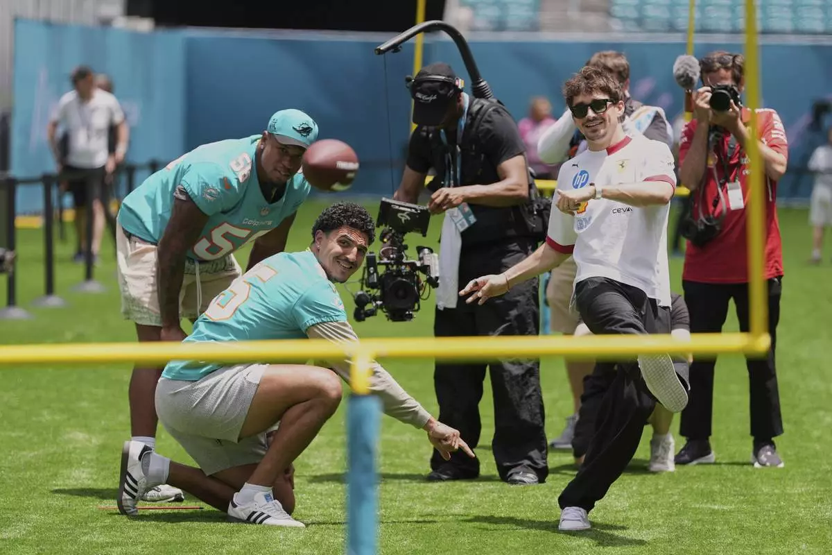 Ferrari driver Charles Leclerc of Monaco, right, kicks a ball as he tries out kicking football field goals with Miami Dolphins linebackers Jaelan Phillips (15) and Quinton Bell (56), during a joint event ahead of the Formula One Miami Grand Prix auto race, Thursday, May 1, 2025, in Miami Gardens, Fla. (AP Photo/Rebecca Blackwell)