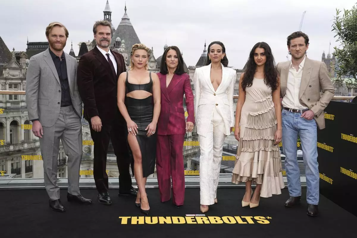 Wyatt Russell, from left, David Harbour, Florence Pugh, Julia Louis-Dreyfus, Hannah John-Kamen, Geraldine Viswanathan and Lewis Pullman pose for photographers at the photo call for the film 'Thunderbolts' on Thursday, April 24, 2025, in London. (Photo by Scott A Garfitt/Invision/AP)