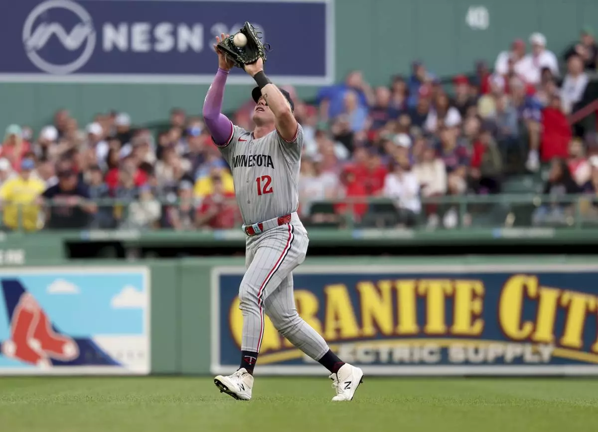 Minnesota Twins outfielder Harrison Bader catches a pop fly for a third out during the third inning of a baseball game against the Boston Red Sox, Sunday, May 4, 2025, in Boston. (AP Photo/Mark Stockwell)
