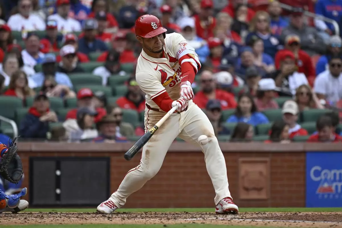 St. Louis Cardinals' Willson Contreras hits a two-run single in the fourth inning during the first baseball game of a doubleheader against the New York Mets, Sunday, May 4, 2025, in St. Louis. (AP Photo/Joe Puetz)