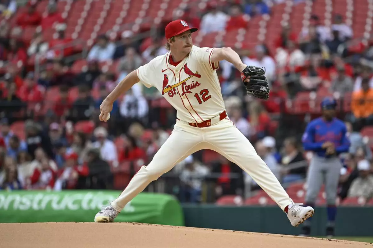 St. Louis Cardinals starting pitcher Erick Fedde throws in the first inning during the first baseball game of a doubleheader against the New York Mets, Sunday, May 4, 2025, in St. Louis. (AP Photo/Joe Puetz)