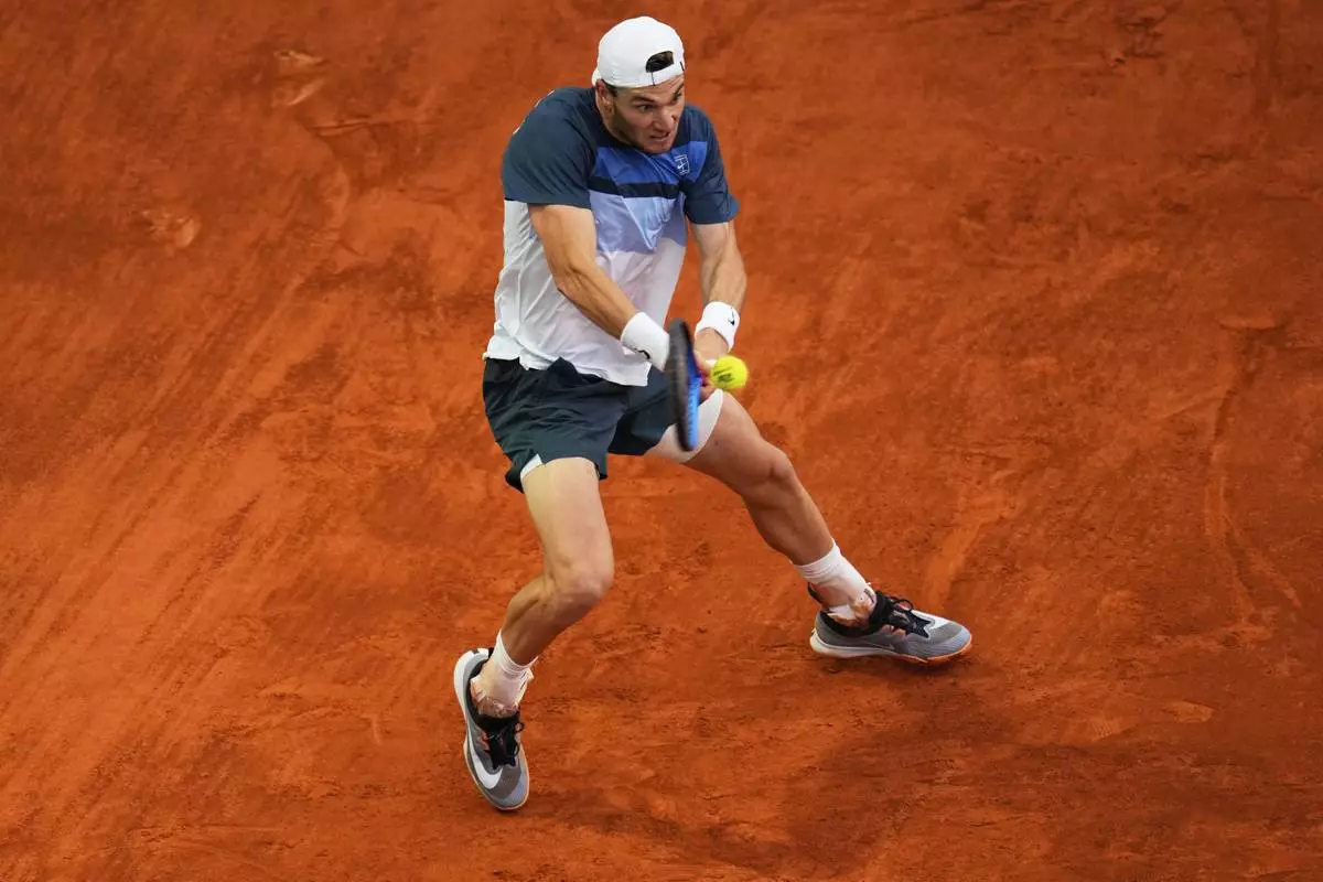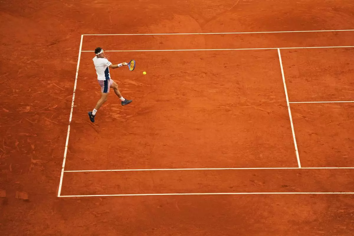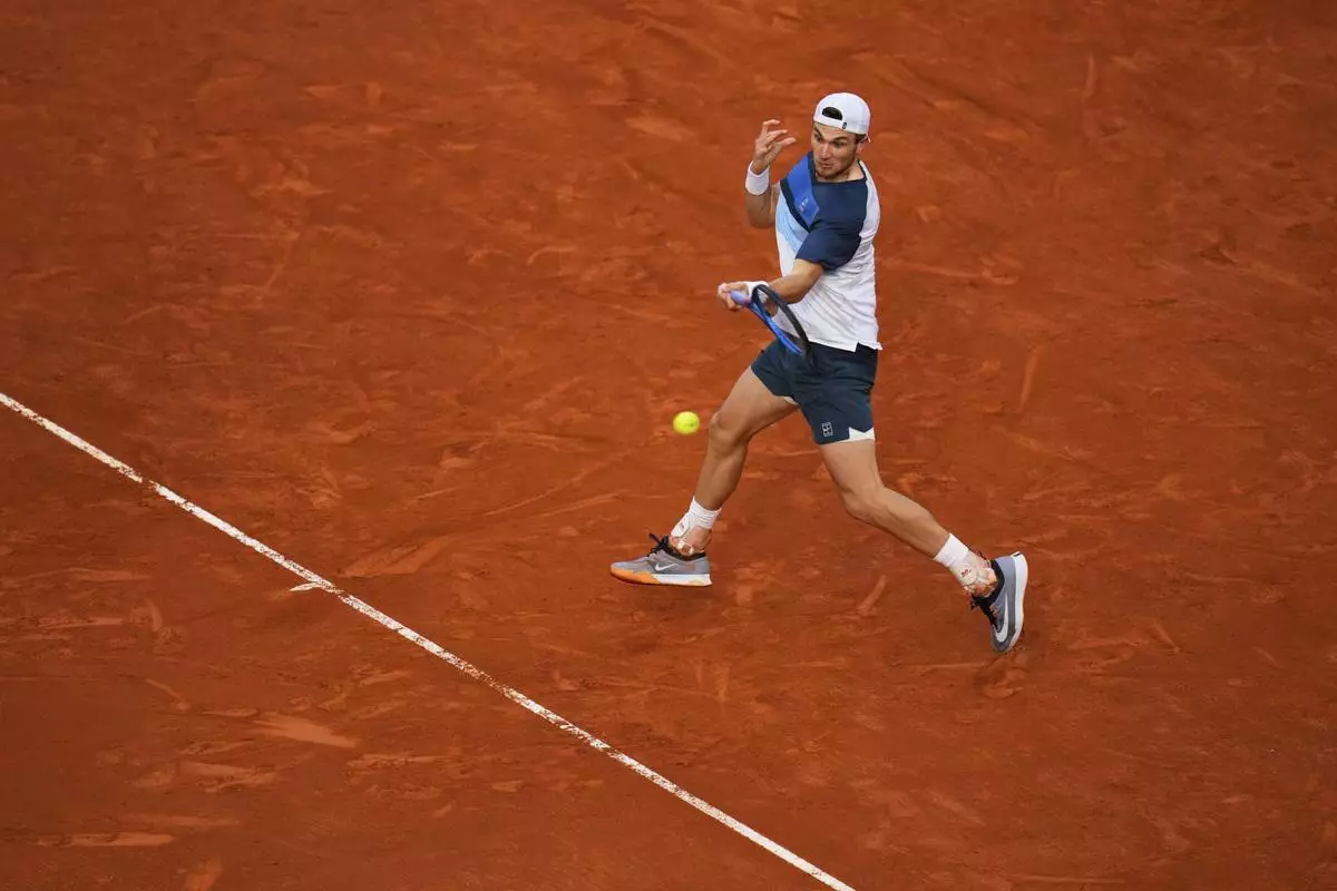 Britain's Jack Draper returns to Norway's Casper Ruud during the Madrid Open tennis final in Madrid, Spain, Sunday, May 4, 2025. (AP Photo/Manu Fernandez)