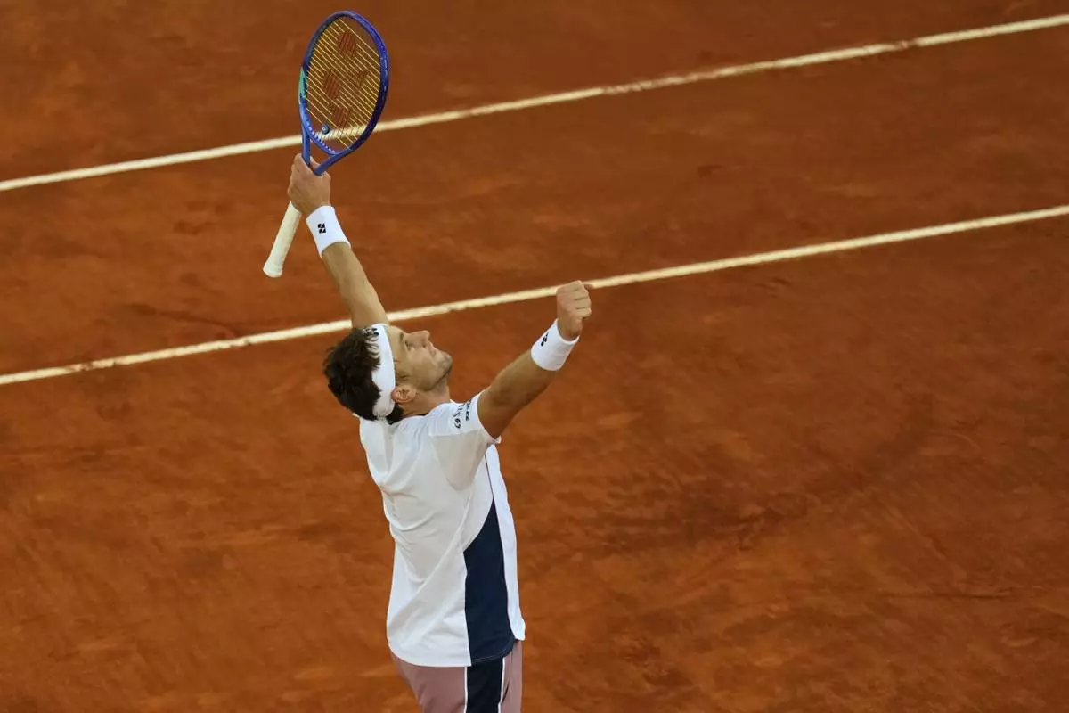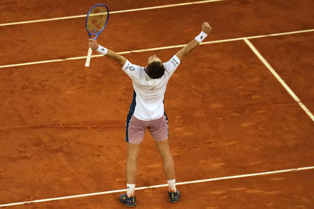 Norway's Casper Ruud reacts after winning the Madrid Open tennis final against Britain's Jack Draper in Madrid, Spain, Sunday, May 4, 2025. (AP Photo/Manu Fernandez)