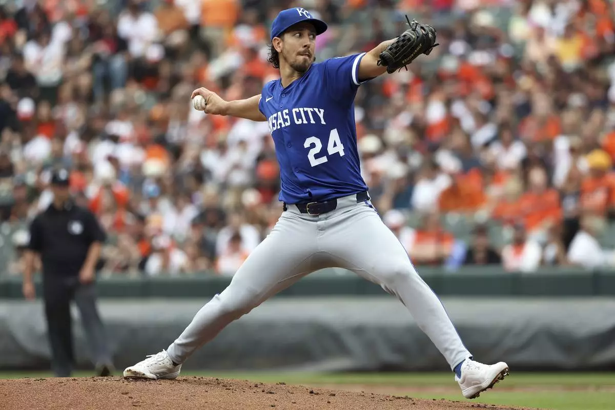 Kansas City Royals pitcher Michael Lorenzen throws the ball during the first inning of a baseball game against the Baltimore Orioles, Sunday, May, 4 2025, in Baltimore. (AP Photo/Daniel Kucin Jr.)