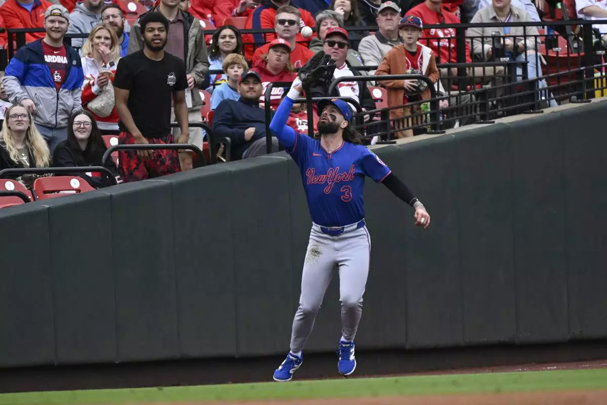 New York Mets left fielder Jesse Winker catches a fly ball hit by St. Louis Cardinals' Nolan Gorman in the third inning during the first baseball game of a doubleheader, Sunday, May 4, 2025, in St. Louis. (AP Photo/Joe Puetz)