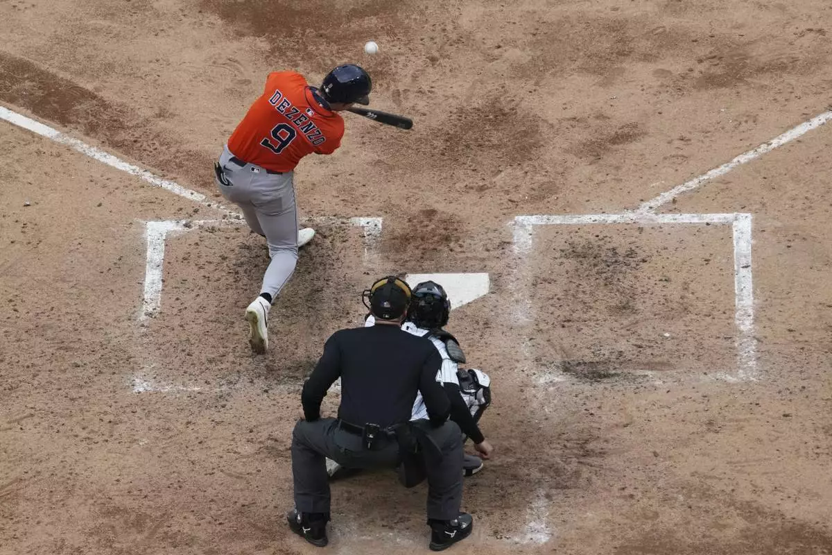 Houston Astros' Zach Dezenzo (9) hits a two-run home run during the fifth inning of a baseball game against the Chicago White Sox in Chicago, Sunday, May 4, 2025. (AP Photo/Nam Y. Huh)