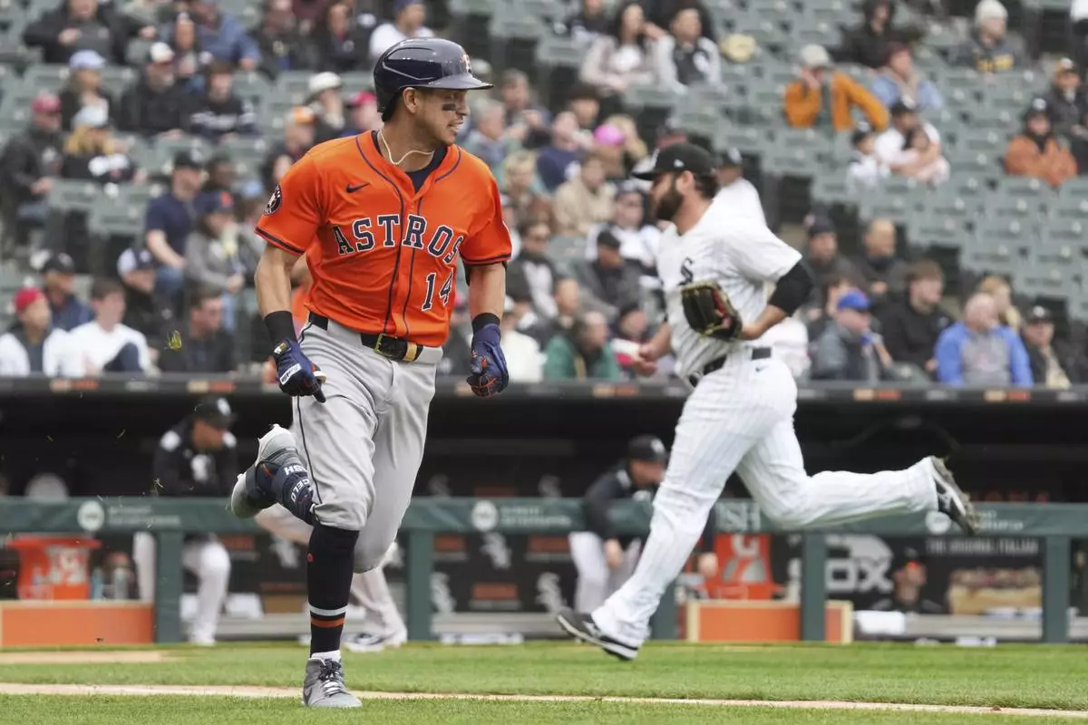 Houston Astros' Mauricio Dubón, left, runs after hitting a two-run single during the second inning of a baseball game against the Chicago White Sox in Chicago, Sunday, May 4, 2025. (AP Photo/Nam Y. Huh)
