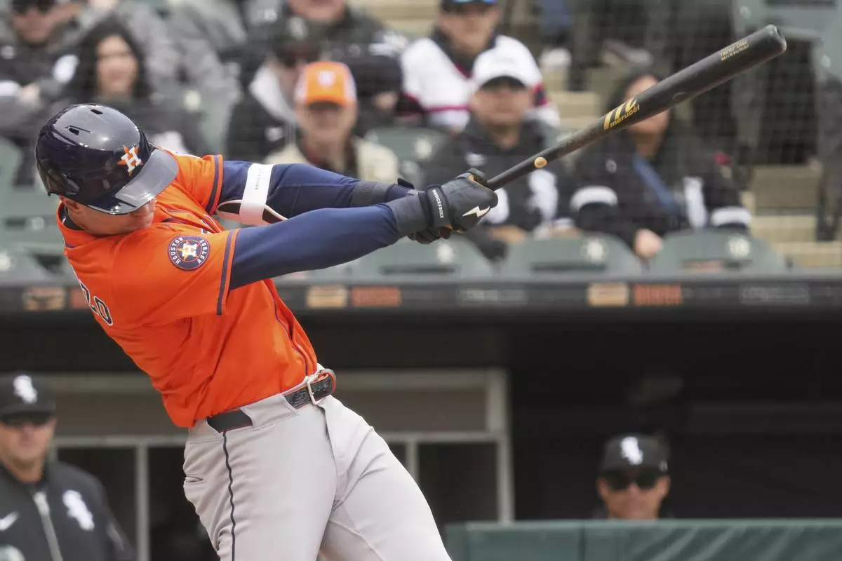 Houston Astros' Zach Dezenzo hits a single during the second inning of a baseball game against the Chicago White Sox in Chicago, Sunday, May 4, 2025. (AP Photo/Nam Y. Huh)