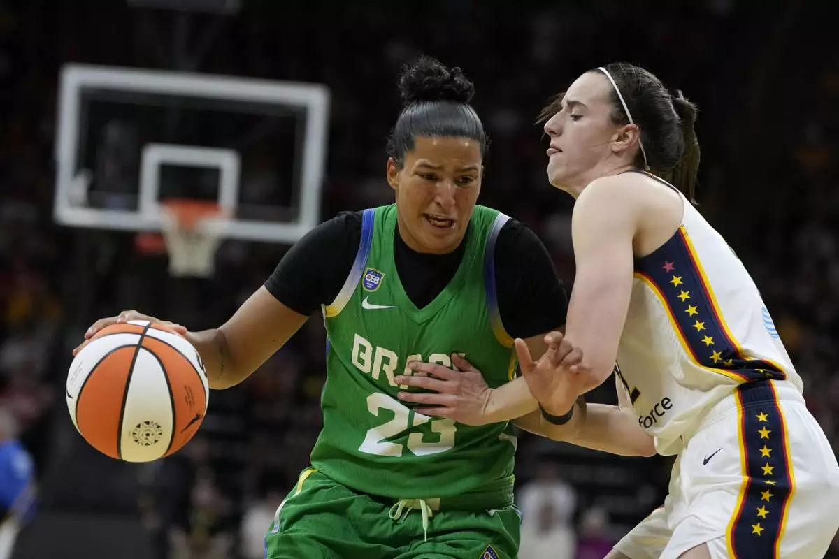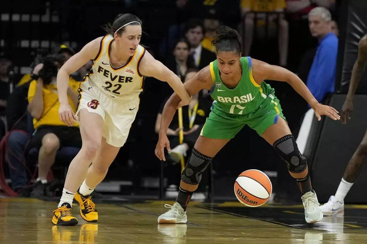 Brazil guard Izabela Leite (23) drives past Indiana Fever guard Caitlin Clark, right, during the first half of an exhibition women's basketball game, Sunday, May 4, 2025, in Iowa City, Iowa. (AP Photo/Charlie Neibergall)
