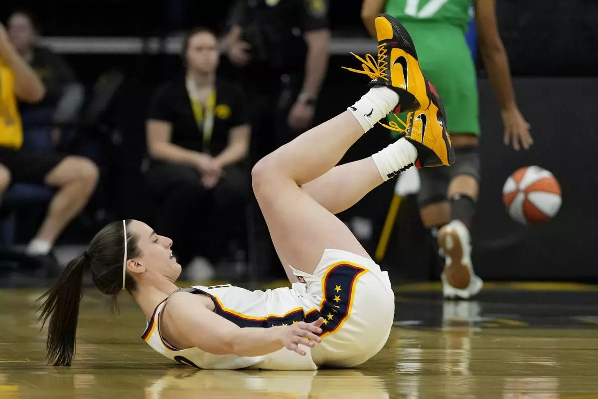 Indiana Fever guard Caitlin Clark falls after making a 3e-point basket during the first half of an exhibition women's basketball game against Brazil, Sunday, May 4, 2025, in Iowa City, Iowa. (AP Photo/Charlie Neibergall)