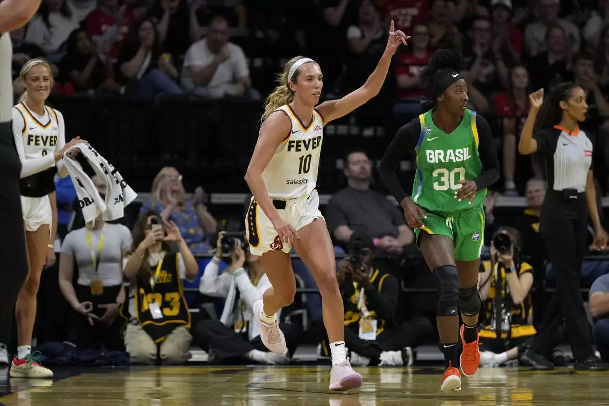 Indiana Fever guard Lexie Hull (10) celebrates after making a 3-point basket during the first half of an exhibition women's basketball game against Brazil, Sunday, May 4, 2025, in Iowa City, Iowa. (AP Photo/Charlie Neibergall)