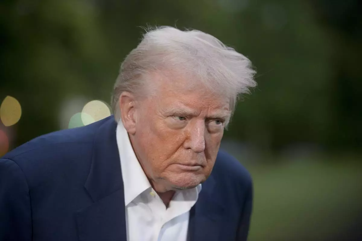 President Donald Trump speaks with reporters after disembarking Marine One upon arrival on the South Lawn of the White House in Washington, Sunday, May 4, 2025. (AP Photo/Rod Lamkey, Jr.)
