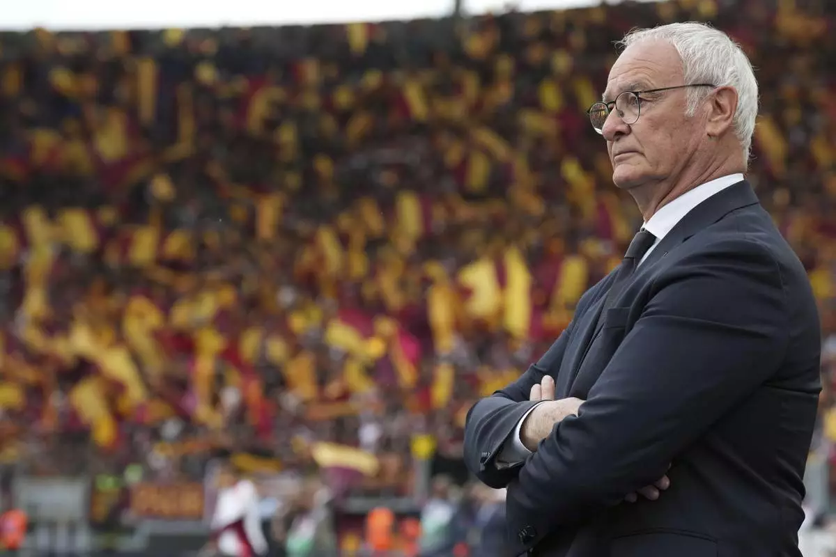 Roma's head coach Claudio Ranieri looks on during the Italian Serie A soccer match between Roma and Fiorentina at Rome's Olympic stadium, Italy, Sunday, May 4, 2025. (Alfredo Falcone/LaPresse via AP)