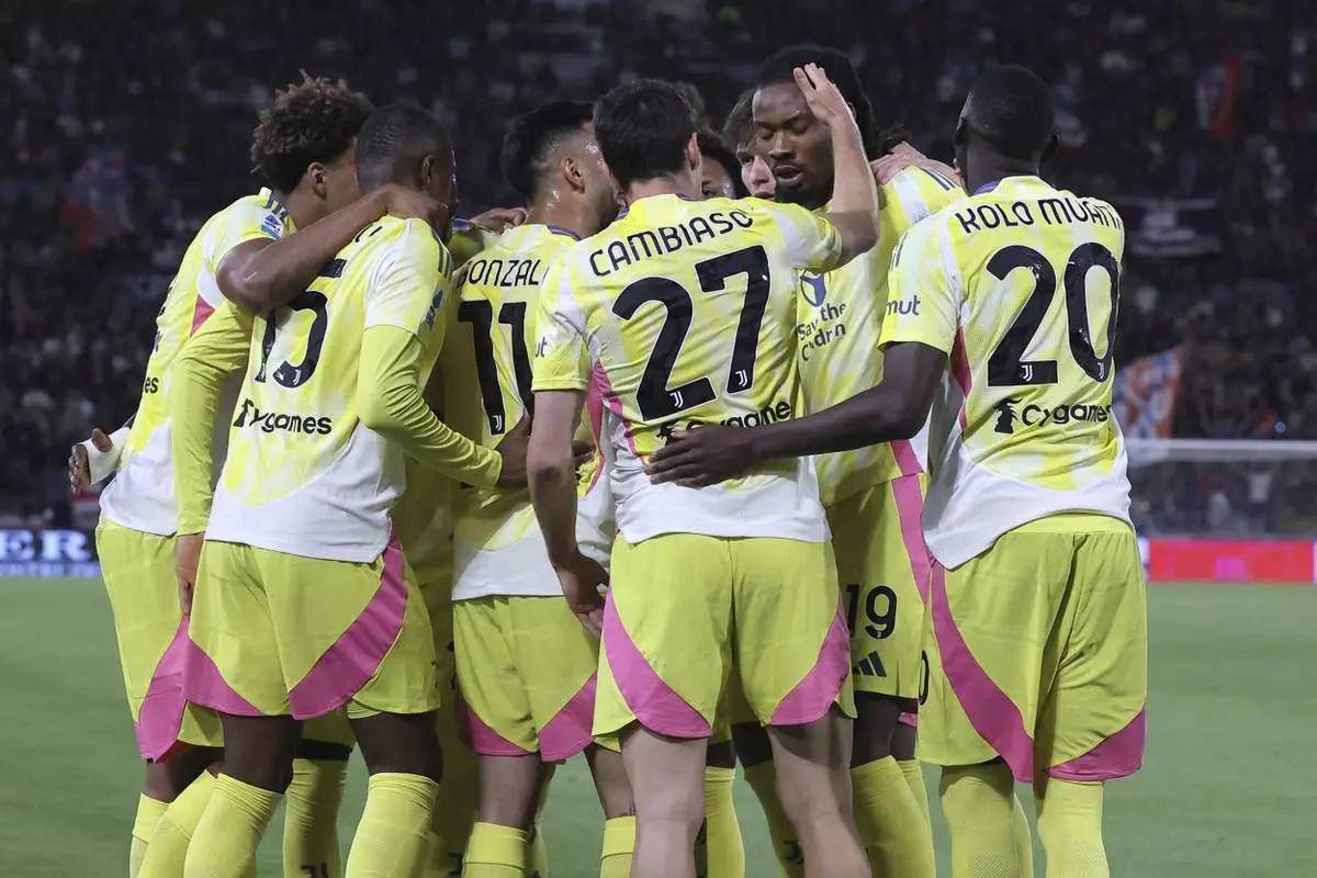 Juventus's Khephren Thuram celebrates with teammates after scoring a goal during a Serie A Enilive 2024/2025 soccer match against Bologna at Renato Dall'Ara Stadium in Bologna, Italy, Sunday, May 4, 2025. (Michele Nucci/LaPresse via AP)
