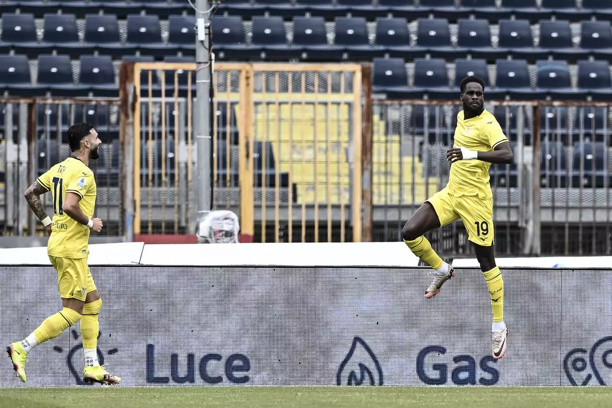 Lazio's Boulaye Dia celebrates his goal during the Italian Serie A soccer match between Empoli and Lazio at the "Carlo Castellani - Computer Gross Arena" Stadium in Empoli, Italy, Sunday, May 4, 2025. (LaPresse via AP)
