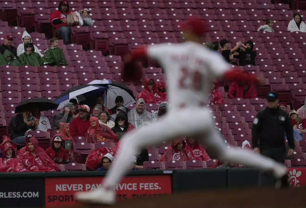 Fans sit in the rain as Cincinnati Reds pitcher Nick Martinez throws during the sixth inning of a baseball game against the Washington Nationals, Sunday, May 4, 2025, in Cincinnati. (AP Photo/Carolyn Kaster)