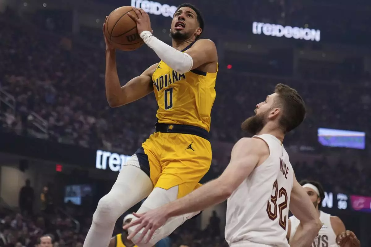 Indiana Pacers' Tyrese Haliburton (0) goes to the basket in front of Cleveland Cavaliers' Dean Wade (32) in the first half of Game 1 in the Eastern Conference semifinals of the NBA basketball playoffs Sunday, May 4, 2025, in Cleveland. (AP Photo/Sue Ogrocki)