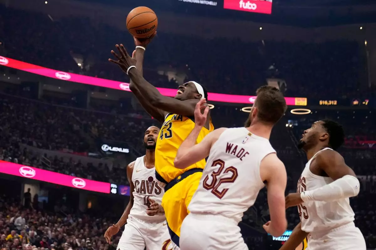 Indiana Pacers forward Pascal Siakam (43) goes to the basket between Cleveland Cavaliers forward Evan Mobley, left, forward Dean Wade (32) and guard Donovan Mitchell, right, in the first half during Game 1 in the Eastern Conference semifinals of the NBA basketball playoffs Sunday, May 4, 2025, in Cleveland. (AP Photo/Sue Ogrocki)