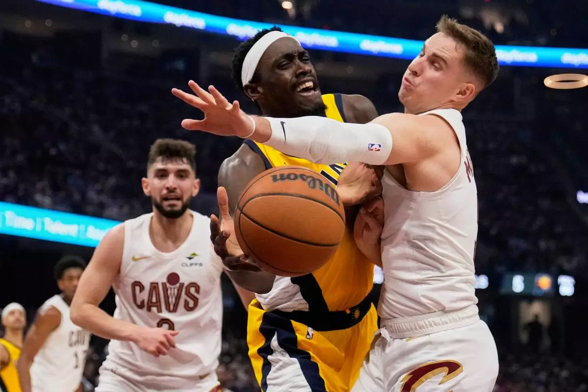 Indiana Pacers forward Pascal Siakam, center, is fouled by Cleveland Cavaliers guard Sam Merrill, right, in the first half during Game 1 in the Eastern Conference semifinals of the NBA basketball playoffs Sunday, May 4, 2025, in Cleveland. (AP Photo/Sue Ogrocki)