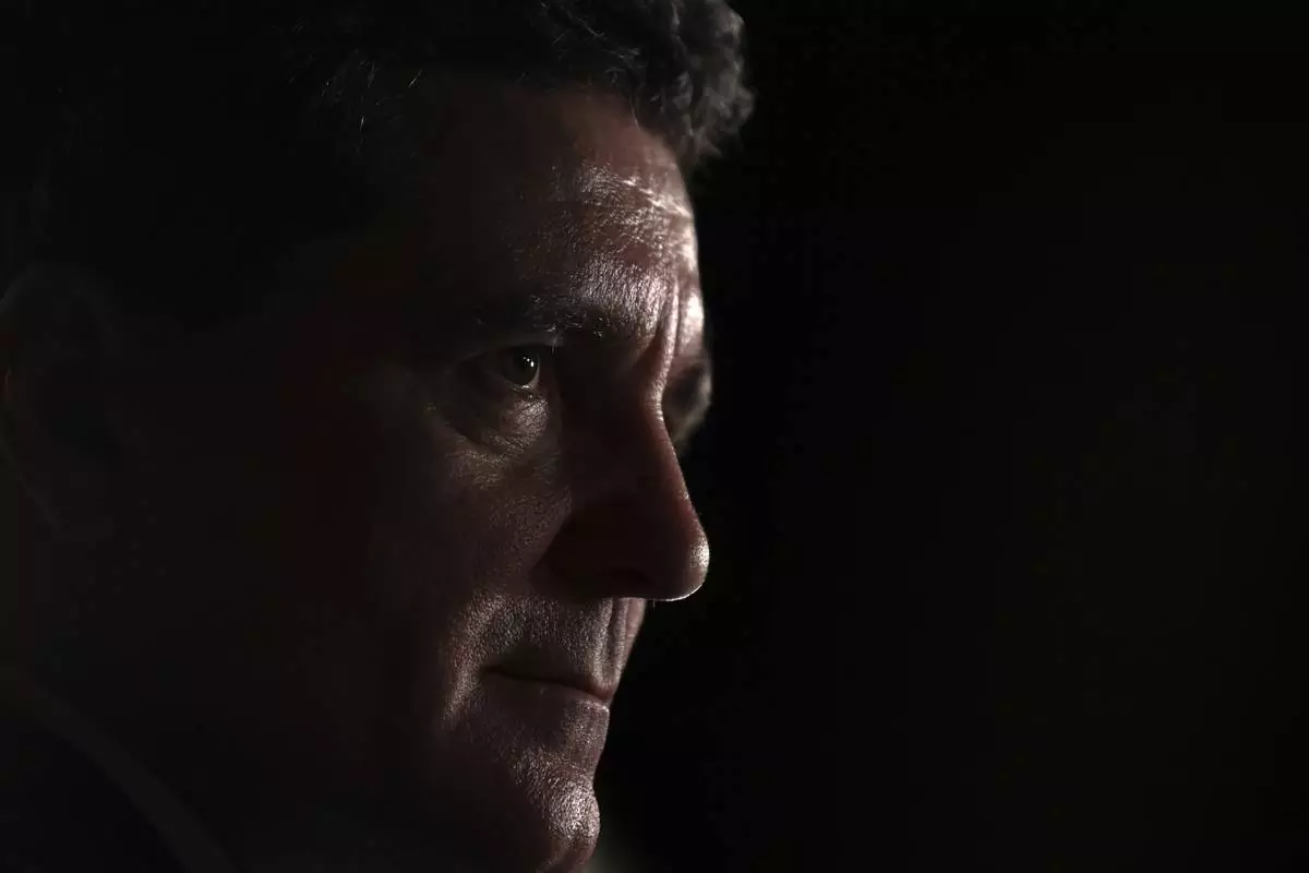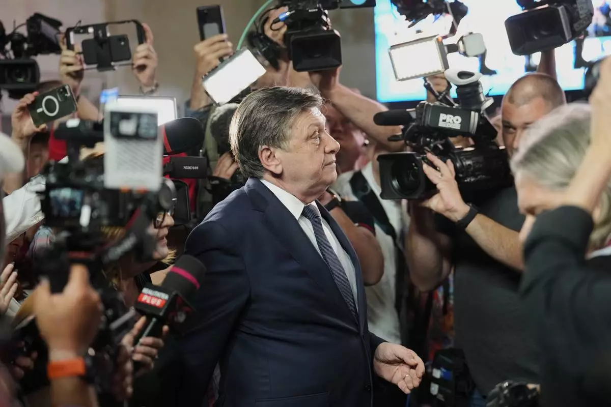 Presidential candidate Crin Antonescu walks surrounded by media shortly before polls closing during the first round of the country's presidential election redo in Bucharest, Romania, Sunday, May 4, 2025. (AP Photo/Vadim Ghirda)