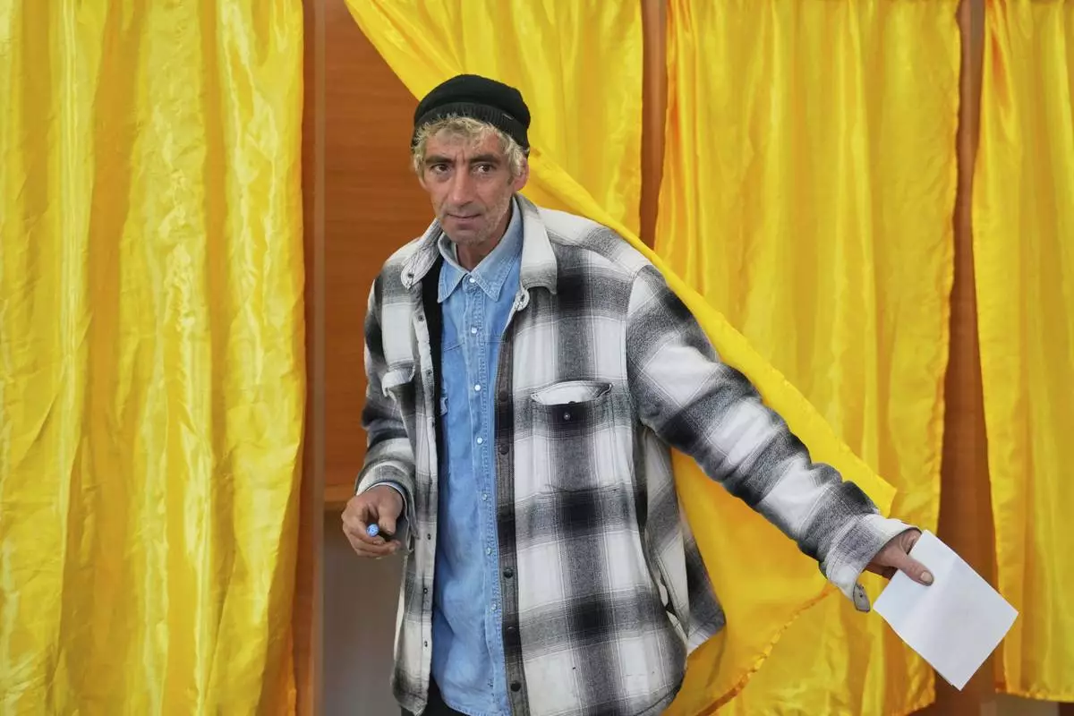 A man exits a voting cabin before casting his vote in the first round of the presidential election redo in Mogosoaia, Romania, Sunday, May 4, 2025. (AP Photo/Vadim Ghirda)