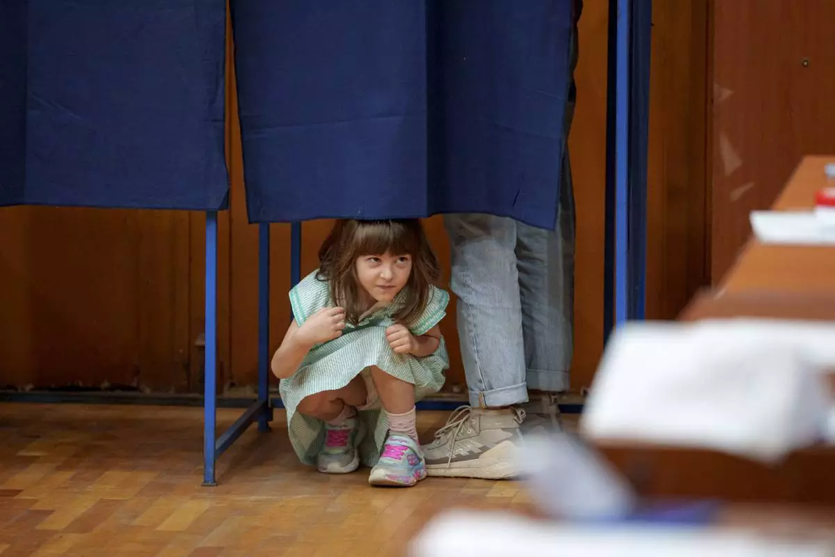 A little girl peers from under a curtain as her father casts his vote in a voting booth in the first round of the presidential election redo in Bucharest, Romania, Sunday, May 4, 2025. (AP Photo/Andreea Alexandru)