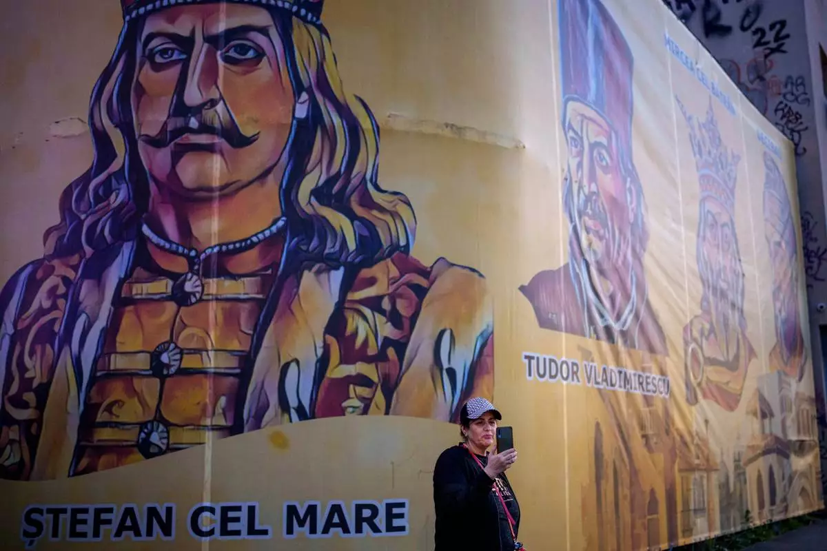A woman holds up a mobile phone backdropped by depictions of Romanian historical figures outside the headquarters of the Alliance for the Unity of Romanians (AUR) shortly before polls close in the first round of the country's presidential election redo in Bucharest, Romania, Sunday, May 4, 2025. (AP Photo/Andreea Alexandru)