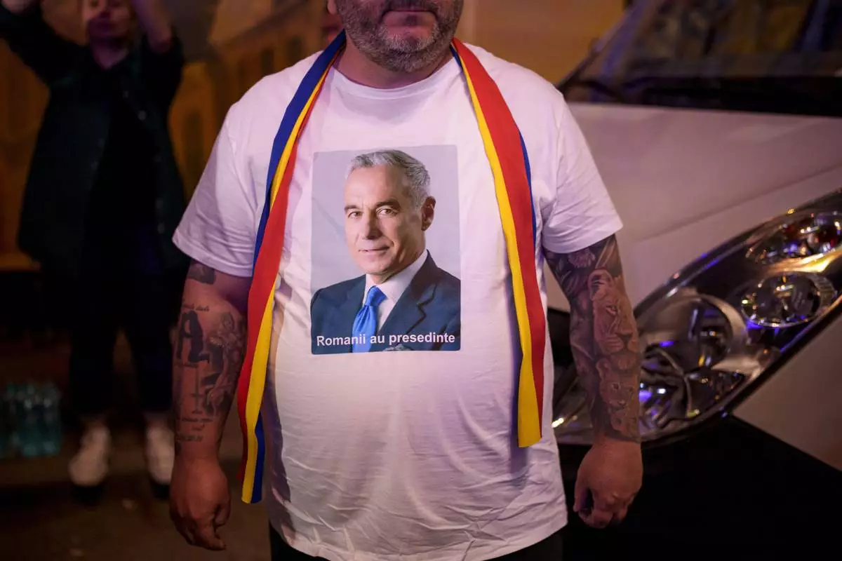A man wears a t-shirt showing Calin Georgescu, winner of the first round of last year's voided election outside the headquarters of presidential candidate George Simion, after polls closed during the first round of the country's presidential election redo in Bucharest, Romania, Sunday, May 4, 2025. (AP Photo/Andreea Alexandru)